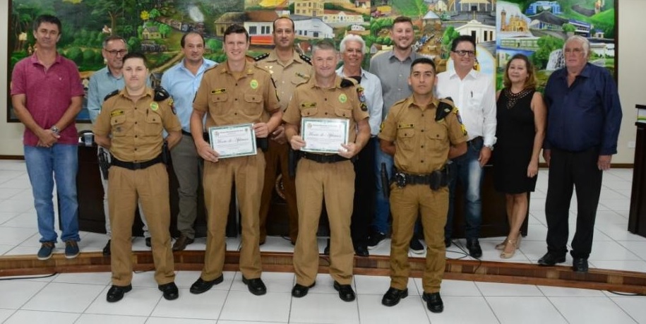 Na Sessão da última terça-feira, dia 19 de março, a Câmara Municipal de Rio Azul, por iniciativa do Vereador Zerico José Nepomoceno, outorgou Moção de aplausos ao Soldado da Polícia Militar Miguel Coloda e ao Cabo da Polícia Militar Cesar Maidel, pelo ato considerado de heroísmo quando, no dia 16 de dezembro de 2018, atuaram de forma a salvar um cidadão que atentava contra própria existência atirando-se de cima de uma das torres de telefonia da cidade.