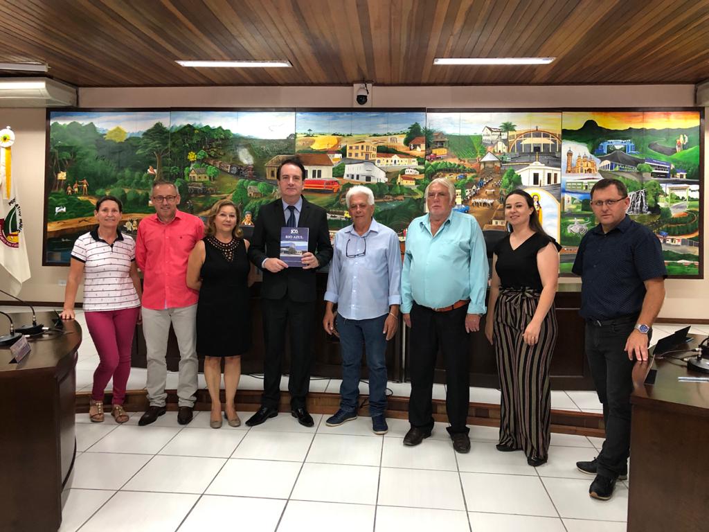 Depois de conversar com os vereadores e conhecer a Casa, o Cônsul foi presenteado com um exemplar do Livro “Rio Azul 100 anos ...”. O Cônsul esteve ainda visitando o senhor Prefeito e a noite participou do evento Miss Rio Azul.